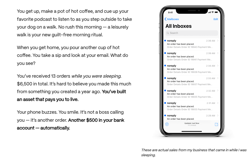 Most readers become overwhelmed with simple text, so they visually demonstrating how your offer can improve their life is another great copywriting tip. In this landing page, you’ll see a calendar image of what their calendar currently looks like and then a screenshot of orders coming in while Ramit was sleeping.