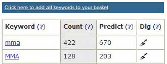 All of that information is useful, but I know next to nothing about mixed martial arts, so I suspected I was missing something. I decided to “dig” a little further with Wordtracker’s Keyword Universe tool—a nifty little program that searches the web for related keywords. After a few minutes, it spit out the following results: