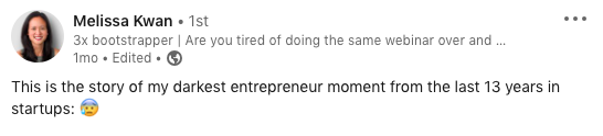 - It’s emotional (“my darkest entrepreneur moment”)